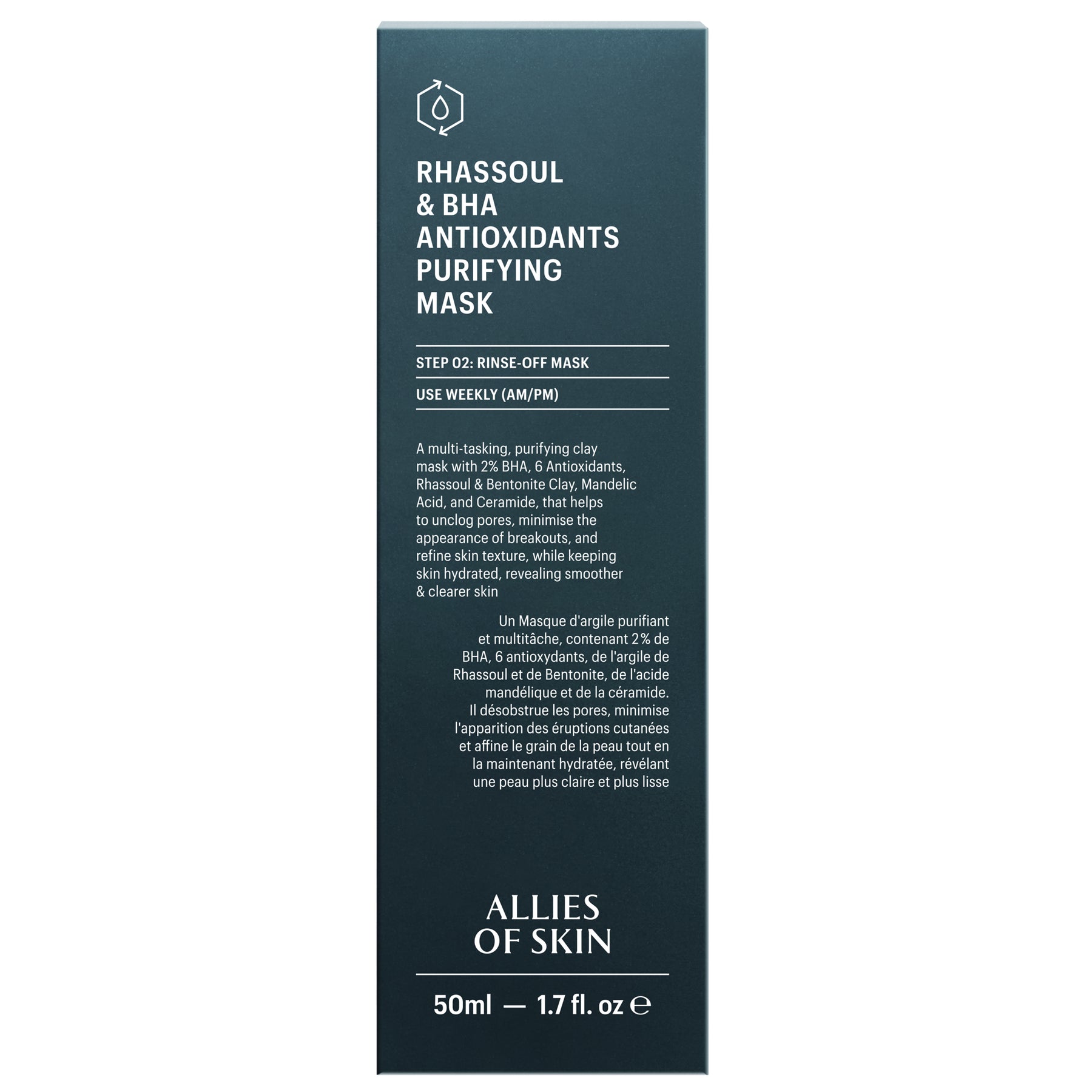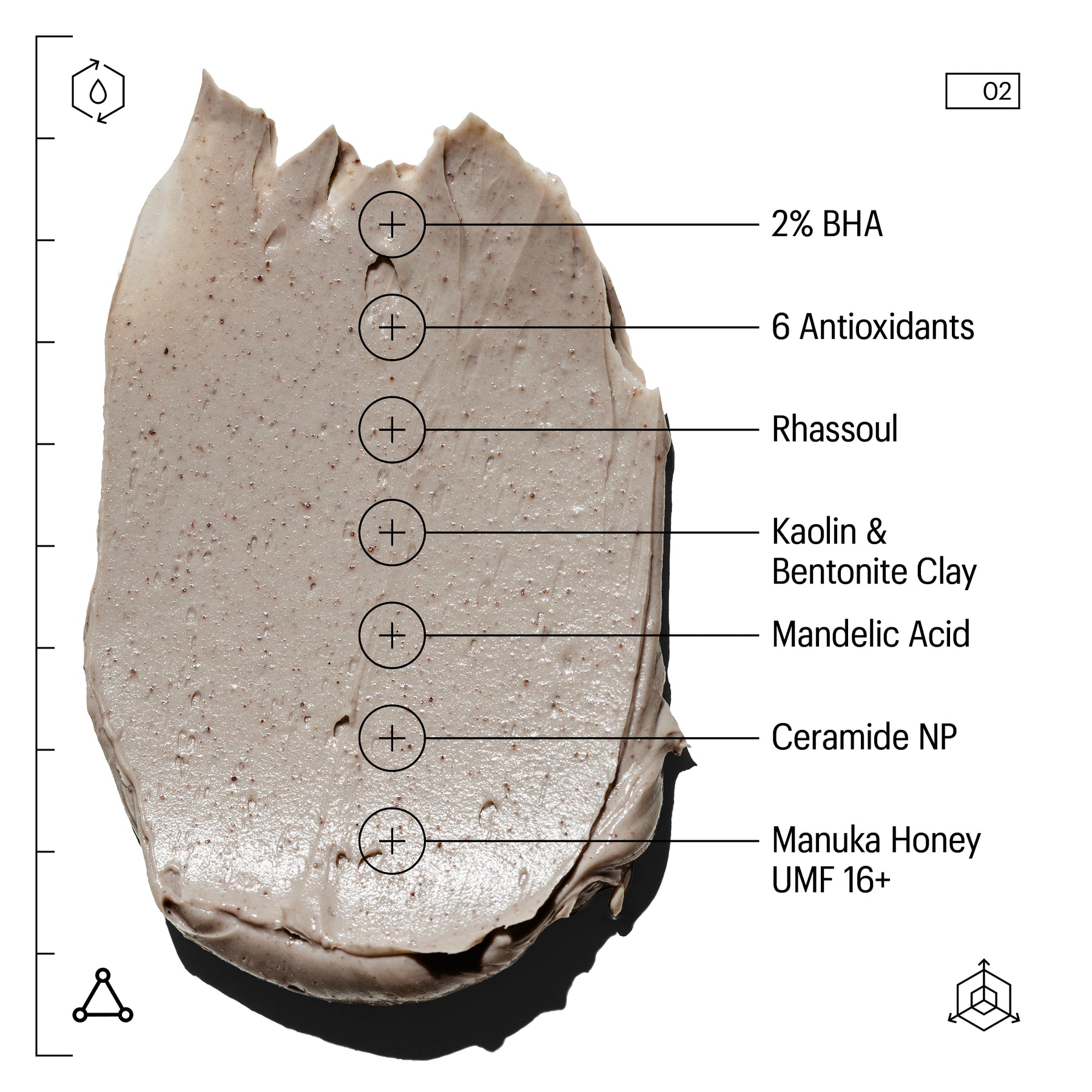 A multi-tasking hero, this Rhassoul & BHA Antioxidants Purifying Mask doesn't have just 1 benefit, it has 5, helping you achieve multiple benefits in 1 application. Alongside providing that breathable, fresh-faced feeling you get from a purifying clay mask, our next-generation clay mask unites a high-performance blend of active ingredients including: 2% BHA, 6 Antioxidants, Rhassoul, Kaolin & Bentonite Clay, Mandelic Acid, Ceramide NP & Manuka Honey UMF 16+ to help clarify, decongest pores and reduce blackheads, boost radiance, deliver antioxidant protection, and lightly hydrate the skin.