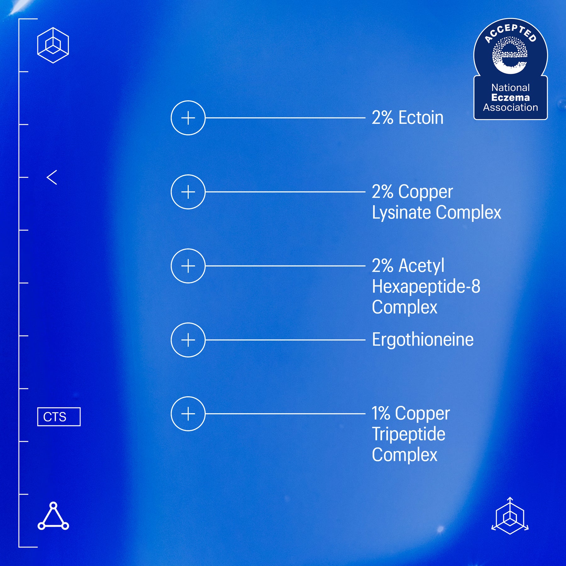 2% Copper Lysinate Complex, 2% Acetyl Hexapeptide-8 Complex, 1% Copper Tripeptide Complex, 2% Ectoin, Aqua (Water), Glycerin, Polyglyceryl-10 Oleate, Coco-Caprylate/Caprate, Isononyl Isononanoate, Dimethyl Isosorbide, Panthenol, Carnitine, Tocopherol, Oxidized Glutathione, Tropolone, Copper Lysinate/Prolinate, Acetyl Hexapeptide-8, Methylglucoside Phosphate, Hydroxyethylcellulose, Saccharide Isomerate, Ethylhexylglycerin, Sodium Gluconate, Sclerotium Gum, Disodium Phosphate, Sodium Phosphate, Caprylyl Glycol, Propanediol, 1,2-Hexanediol, Hydroxyethyl Acrylate/Sodium Acryloyldimethyl Taurate Copolymer, Citric Acid, Polysorbate 60, Sodium Hydroxide, Polysorbate 20, Phenoxyethanol, Ergothioneine