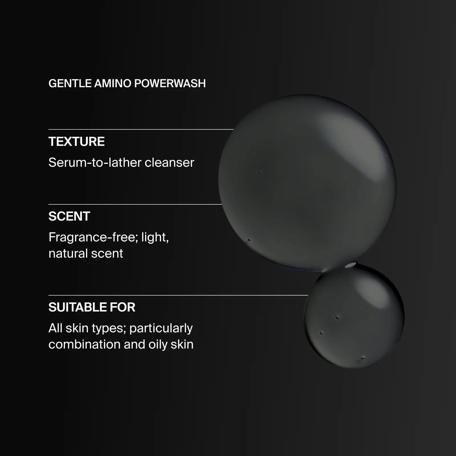 • Gentle Amino Powerwash—serum-to-lather cleanser that encourages cell turnover.