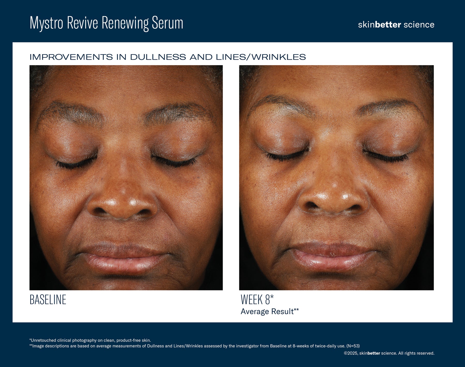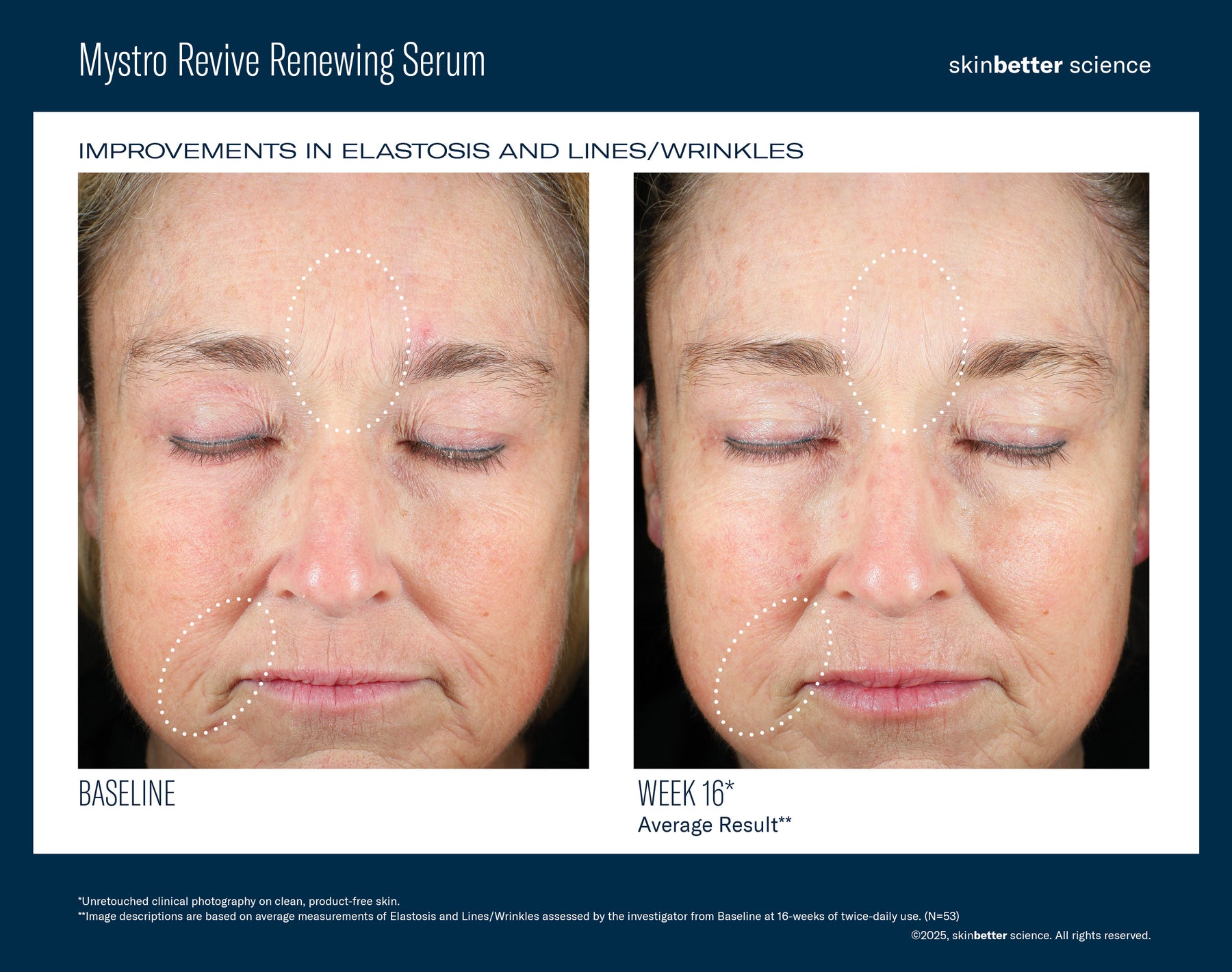 - *A multi-center, dermatologist and plastic surgeon-led clinical trial evaluated twice-daily use of Mystro Revive Renewing Serum in peri- and menopausal females 46+ years of age with fine-to-moderate lines/wrinkles and mild-to-moderate elastosis and crepey skin over 16 weeks. (N=53).