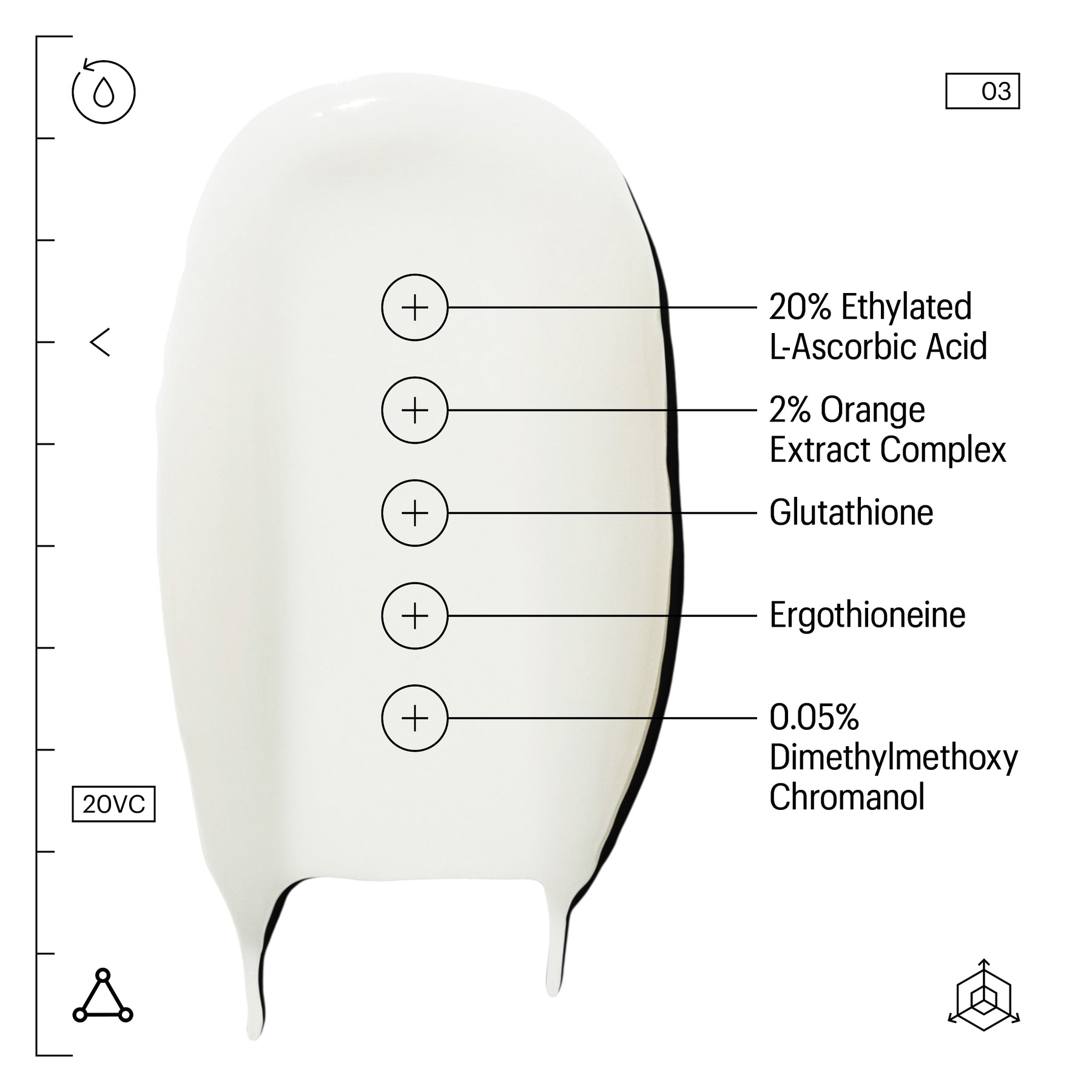 20% Ethylated L-Ascorbic Acid A newer, more stable form of Vitamin C. Fades imperfections, boosts collagen production, and provides excellent photoprotection underneath sunscreen.