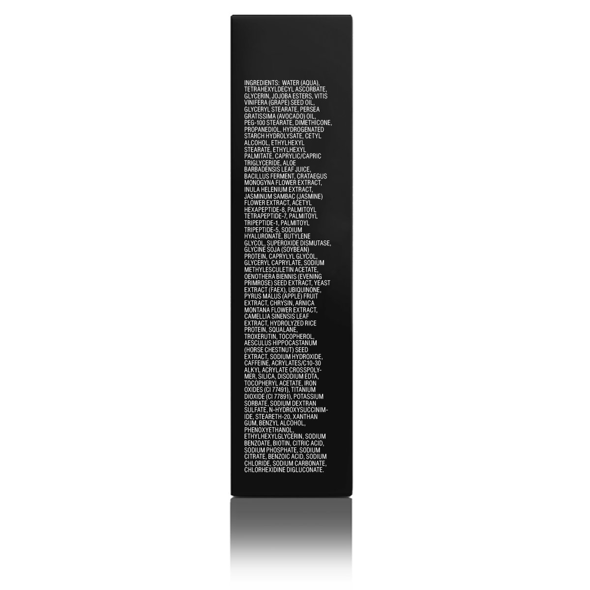 WATER (AQUA), TETRAHEXYLDECYL ASCORBATE, GLYCERIN, JOJOBA ESTERS, VITIS VINIFERA (GRAPE) SEED OIL, GLYCERYL STEARATE, PERSEA GRATISSIMA (AVOCADO) OIL, PEG-100 STEARATE, DIMETHICONE, PROPANEDIOL, HYDROGENATED STARCH HYDROLYSATE, CETYL ALCOHOL, ETHYLHEXYL STEARATE, ETHYLHEXYL PALMITATE, CAPRYLIC/CAPRIC TRIGLYCERIDE, ALOE BARBADENSIS LEAF JUICE, BACILLUS FERMENT, CRATAEGUS MONOGYNA FLOWER EXTRACT, INULA HELENIUM EXTRACT, JASMINUM SAMBAC (JASMINE) FLOWER EXTRACT, ACETYL HEXAPEPTIDE-8, PALMITOYL TETRAPEPTIDE-7, PALMITOYL TRIPEPTIDE-1, PALMITOYL TRIPEPTIDE-5, SODIUM HYALURONATE, BUTYLENE GLYCOL, SUPEROXIDE DISMUTASE, GLYCINE SOJA (SOYBEAN) PROTEIN, CAPRYLYL GLYCOL, GLYCERYL CAPRYLATE, SODIUM METHYLESCULETIN ACETATE, OENOTHERA BIENNIS (EVENING PRIMROSE) SEED EXTRACT, YEAST EXTRACT (FAEX), UBIQUINONE, PYRUS MALUS (APPLE) FRUIT EXTRACT, CHRYSIN, ARNICA MONTANA FLOWER EXTRACT, CAMELLIA SINENSIS LEAF EXTRACT, HYDROLYZED RICE PROTEIN, SQUALANE, TROXERUTIN, TOCOPHEROL, AESCULUS HIPPOCASTANUM (HORSE CHESTNUT) SEED EXTRACT, SODIUM HYDROXIDE, CAFFEINE, ACRYLATES/C10-30 ALKYL ACRYLATE CROSSPOLYMER, SILICA, DISODIUM EDTA, TOCOPHERYL ACETATE, IRON OXIDES (CI 77491), TITANIUM DIOXIDE (CI 77891), POTASSIUM SORBATE, SODIUM DEXTRAN SULFATE, N-HYDROXYSUCCINIMIDE, STEARETH-20, XANTHAN GUM, BENZYL ALCOHOL, PHENOXYETHANOL, ETHYLHEXYLGLYCERIN, SODIUM BENZOATE, BIOTIN, CITRIC ACID, SODIUM PHOSPHATE, SODIUM CITRATE, BENZOIC ACID, SODIUM CHLORIDE, SODIUM CARBONATE, CHLORHEXIDINE DIGLUCONATE.